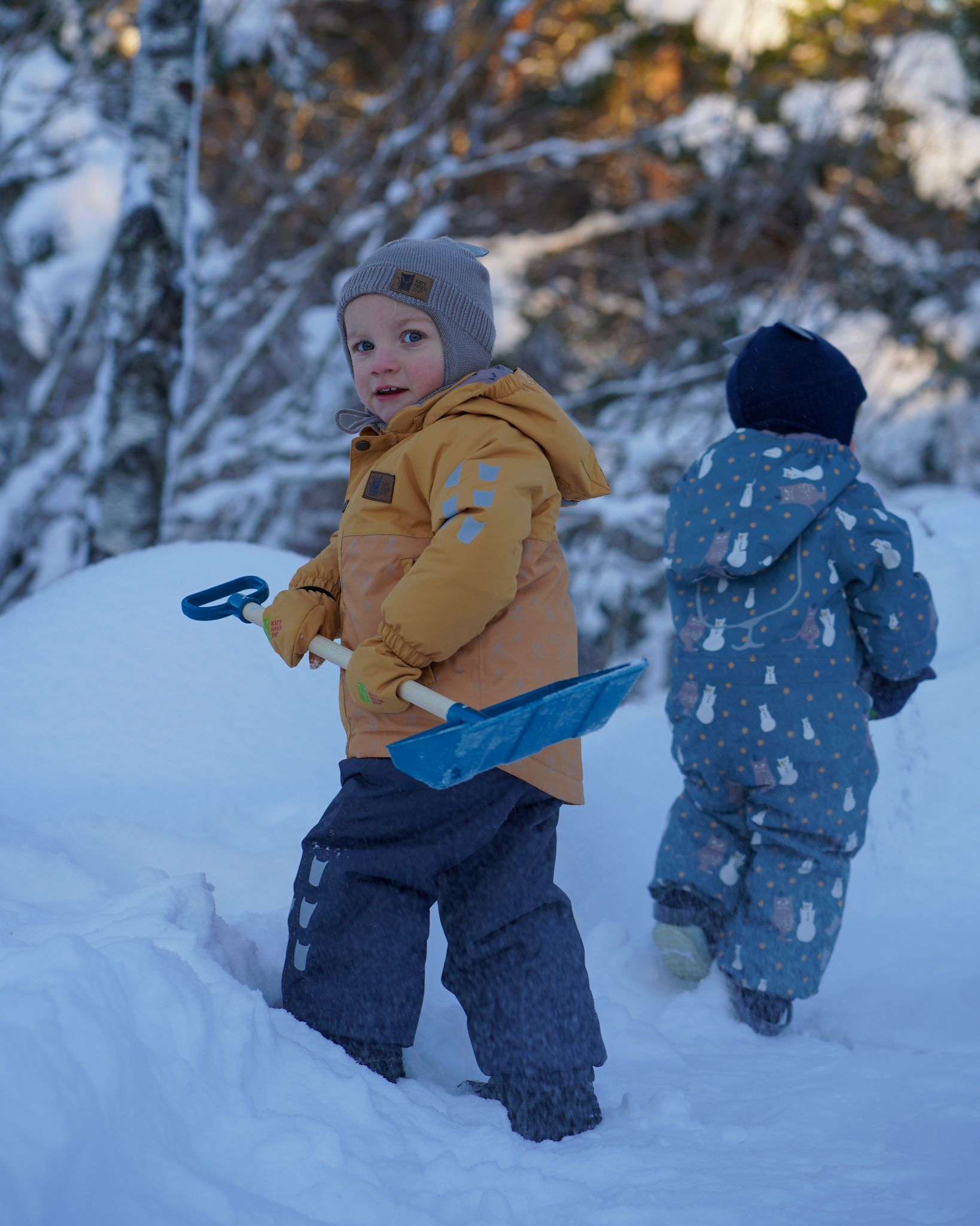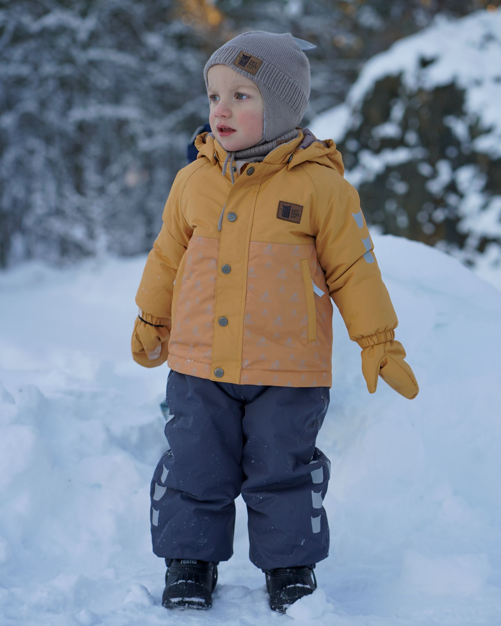 Vårt vintersett består av varm vinterjakke og bukse – med 140 g vattering og slitesterk ytterstoff. Dei blir selde kvar for seg, men passar perfekt saman som sett. Mange foreldre likar den fleksible løysinga: bruk berre jakka når det er mildt, eller buksa med ull under – og heile settet når det er skikkeleg bitande kaldt.
